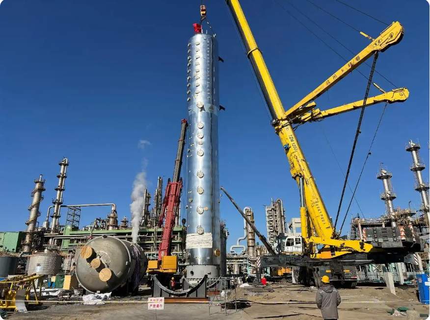 ![]() 此次吊裝的甲醛吸收塔凈重近百噸,是該甲醛裝置最高、最重、吊裝難度最大的核心設備。面對大件運輸復雜、場地空間局限、時間緊迫以及天氣嚴寒等多重挑戰,項目組與業主及安裝單位精密合作,精心策劃吊裝方案。從運輸路線規劃到地基處理,從吊車選型到站位布局,再到荷載計算與作業流程安排,每個環節、每個細節都深入考量、反復推演,確保萬無一失,最終圓滿完成吊裝任務。